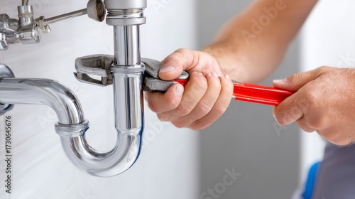 Repairing plumbing under a kitchen sink with adjustable wrenches in a well-lit area