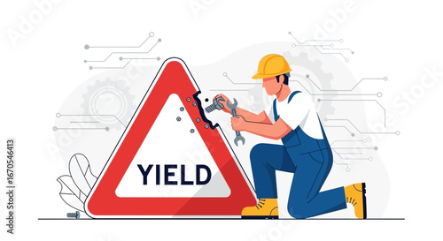 Repairing Technology Infrastructure With Yield Sign And Technician Concept Illustration