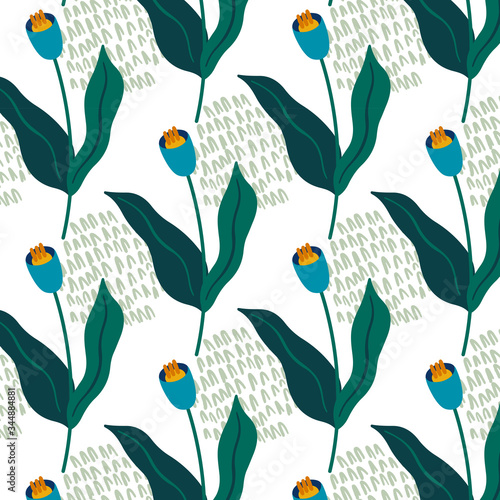 Repeat pattern with tulip flowers in blue and green leaves on white background. Hand drawn background. Vector tiles design. For fashion summer fabric, gift wrap, wallpaper and package design