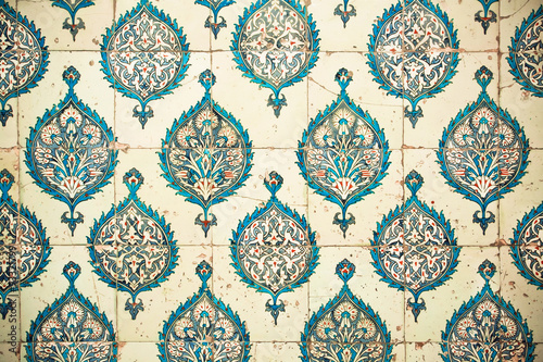Repeating patterns on ceramic tiles in Ottoman style, 15th century Topkapi Palace, Turkey.