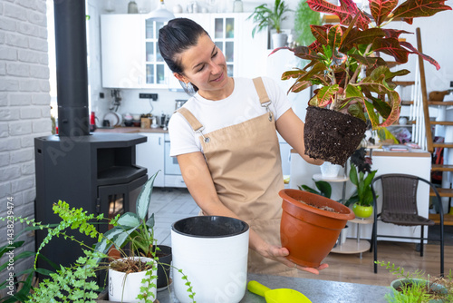 Repotting and caring home plant codium croton into new pot in home interior. Woman breeds and grows plants hobby, holds tropical plant with red leaves