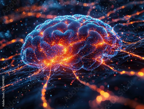 Representation of a vibrant human brain surrounded by glowing neural networks and connections at night
