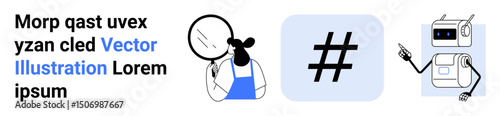 Researcher examines magnifying glass, metadata tag icon symbolizes trends, robot interacts with gesture. Ideal for technology, innovation, social media, research, digital marketing, education simple