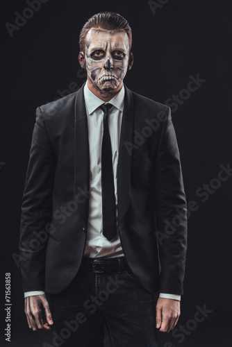 jacket, businessman, man, suit, shirt, dress, code, black, white, attaching, make-up, skeleton, bone, skull, halloween, scarey, nasty, male, face, human, horror, adult, people, studio, gothic, holiday, costume, daemon, monster, dead, dark, art, death, 1, caucasian, fear, person, zombie, necktie, hair, portrait, mask, resentful, frustrated, bitter, hand, sad
