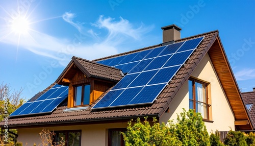 home, house, solar, panel, roof, energy, renewable, sustainable, blue, sky, sun, clear, architecture, residential, building, tile, brown, window, wood, nature, environment, eco, green, modern, technology, clean, efficient, alternative, power, rooftop, daylight, sunny, exterior