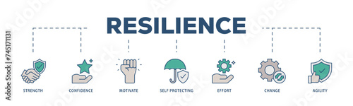 Resilience icons process structure web banner illustration of agility, self protecting, change, effort, motivate, confidence, strength icon live stroke and easy to edit