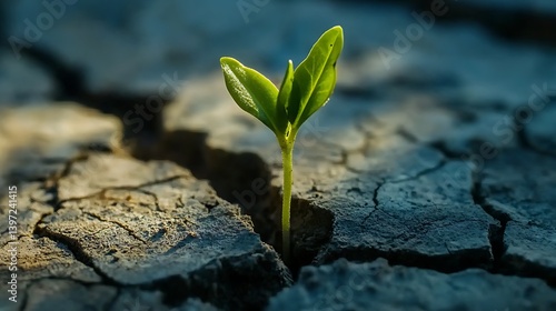 Resilience portrayed through a young plant emerging from cracked earth landscape