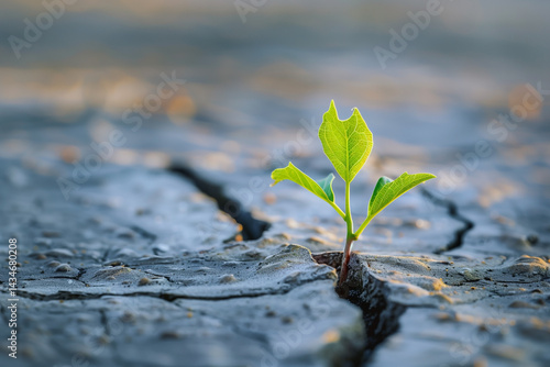 Resilient Sprout: A vibrant green seedling emerges through cracked, dry earth, symbolizing hope and tenacity in harsh environments.