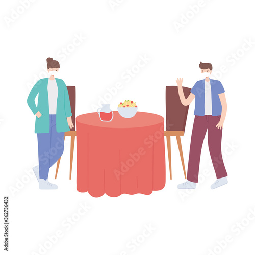 restaurant social distancing, man and woman preventive measures steps to protect yourself, people with medical face mask, covid 19 coronavirus