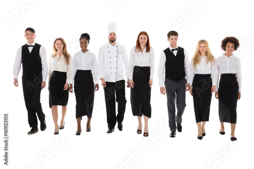 staff, hotel, walking, hospitality, group, eatery, isolated, chef, large, young, people, white, background, african, diverse, waiter, waitress, american, team, man, woman, service, catering, asian