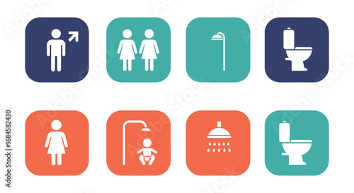 icon, facility, user, privies, shower, sink, baby, changing, table, man, woman, unisex, bathroom, signs, symbol, accessibility, public, space, hygiene, cleaning, maintenance, design, graphic, element, visual, communication, guidance, direction, comfort, convenience, health, sanitation, environment