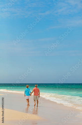 lifestyle, leisure, recreation, bahamas, caribbean, american, caucasian, male, female, senior, retired, mature, couple, living, travel, holiday maker, tour tourism, insurance, vacation, get-away, carefree, freedom, together, togetherness, affectionate, romantic, ocean, sea, wave, shoreline, sand, beach, paradise, tropical, resort, destination, island, people, relaxation, loving, healthy, active, walking, holding, hand, casual attire, clothing