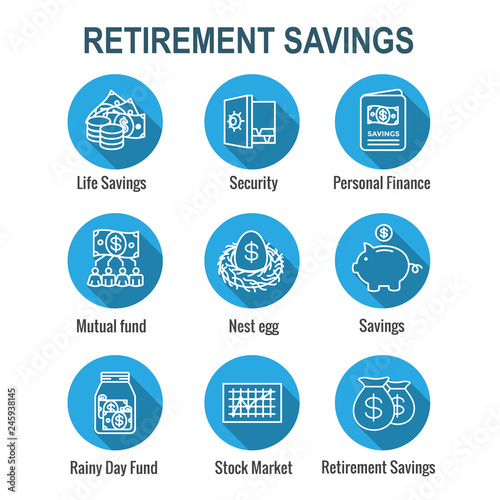 Retirement Account and Savings Icon Set w Mutual Fund, Roth IRA, etc