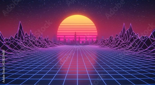 Retro background futuristic landscape 1980s style. Vector perspective grid. 80s sci-fi or game style. Retro neon background