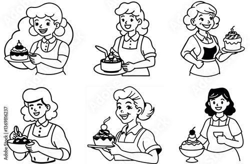 Retro Cartoon Baker Women Line Art Set, Smiling Ladies Serving Cakes, Dessert Outlines