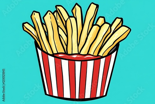 Retro Cartoon French Fries in Striped Carton with Ketchup