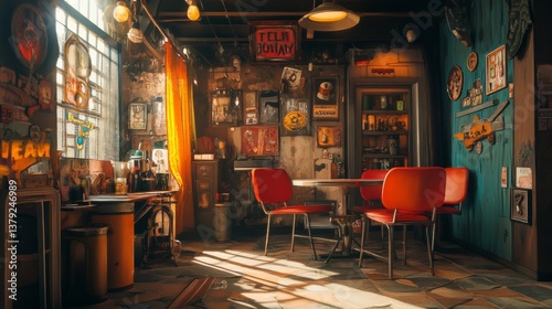 dinner, retro, interior, vintage, chair, decor, eatery, red, nostalgic, signs, classic