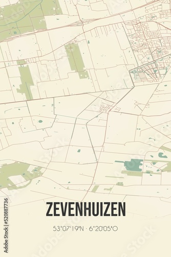 Retro Dutch city map of Zevenhuizen located in Groningen. Vintage street map.