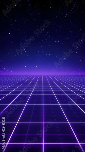 Retro Futuristic Grid Landscape Extends Under a Starry Night Sky with Purple Hues