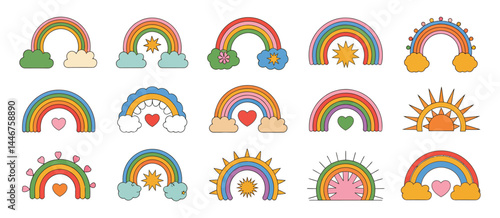 rainbow, clip art, retro, vintage, 70s, illustration, graphic, design element, set, collection, heart, star, sun, sunshine, cloud, colourful, bright, happy, positive, whimsical, cute, childlike, pattern, texture, background, decoration, symbol, love, joy, optimism, summer, spring, floral, flower, vector, isolated, white background