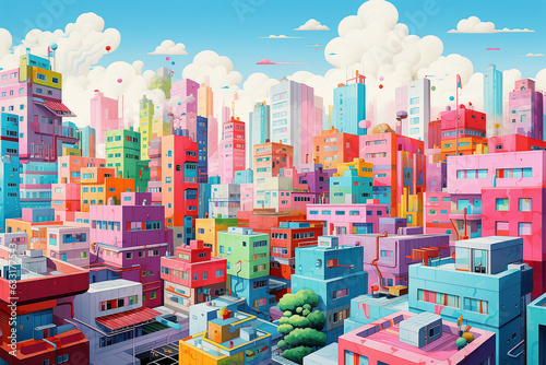 Retro risograph illustration of a crowded city with high rise buildings. Generative ai.
