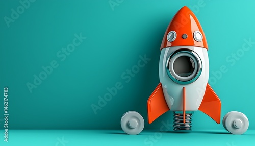 rocket, toy, retro, space, launch, orange, white, spring, wheel, children, fun, childhood, imagination, adventure, futuristic, design, three-dimensional, model, rendering, illustration, graphic, modern, bright, teal, background, isolated, standing, simple, cute, play, creative, innovation, technology, future, concept, colourful, art, animation, digital