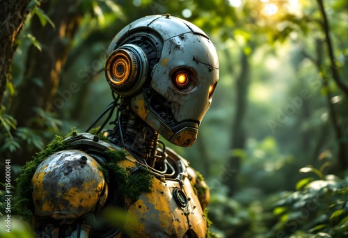 robot, android, cyborg, science fiction, futuristic, mechanical, forest, nature, technology, artificial, intelligence, machine, automaton, metallic, green, orange, rustic, wood, environmental, fantasy, science, fiction, future, tech, machinery, robotic, computerized, electronic, android, automated, ai, vegetation, jungle, foliage, innovative, digital, synthetic, industrial, advanced, engineered, mechanism, wilderness, outdoors, ecosystem, biotechnology, interface, circuit, processor, computing