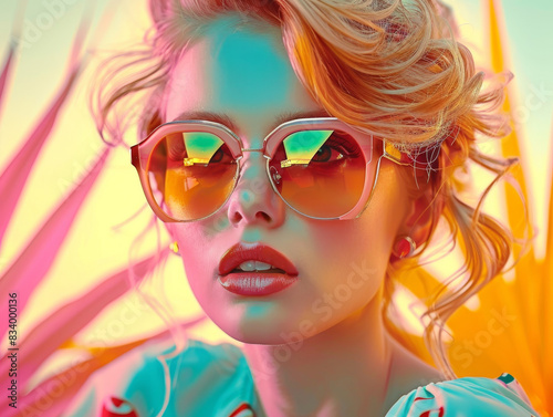 woman, summer, vacation, fashion, sunglasses, retro, vintage, collage, poster, generative, ai, beauty, face, hair, model, goggles, glamour, lip, mask, carnival, person, style, people, fun, make-up, red, 1, lady, outdoors