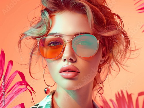 woman, summer, vacation, fashion, sunglasses, retro, vintage, collage, poster, generative, ai, beauty, face, hair, model, goggles, glamour, lip, mask, carnival, person, style, people, fun, make-up, red, 1, lady, outdoors