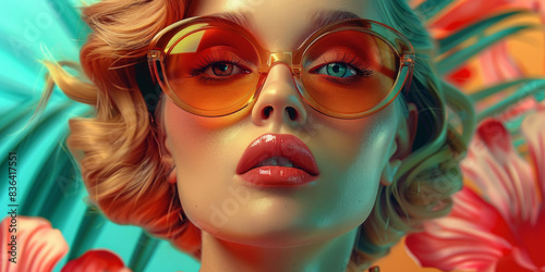 woman, summer, vacation, fashion, sunglasses, retro, vintage, collage, poster, generative, ai, beauty, face, hair, model, goggles, glamour, lip, mask, carnival, person, style, people, fun, make-up, red, 1, lady, outdoors