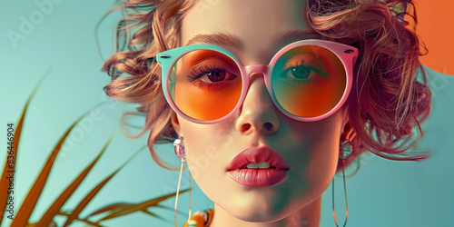 Retro style pastel colors summer background. Fashion woman wearing big sunglasses.