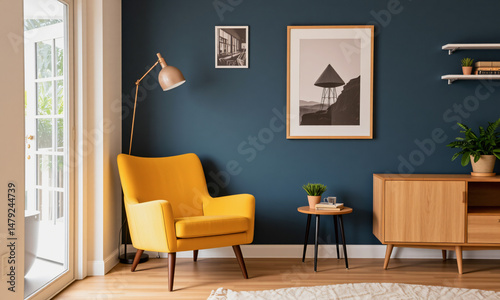 Retro-style home interior with mustard yellow armchair and navy blue wall mid-century modern decor Generative AI
