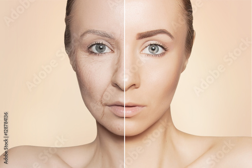 healthy, half, model, white, care, 2, process, person, woman, young, girl, beautiful, senior, mature, caucasian, portrait, background, life, wrinkled, skin, skincare, face, wrinkle, ageing, old, age, female, health, problem, procedure, christmas, snow, snowflake, winter, christmas, present, advertisement, design, copy space, advertising, isolated, senescence, half, revitalization, beige, gold, gold, pink, warm