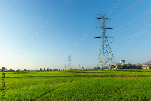 Rice fields and high-voltage electric poles, Rice field with Arrangement of High voltage pole, Transmission tower on rice field in countryside at sunset. The sun rise over rice field and tower electri
