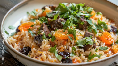 pilaf, rice, mouton, apricot, prune, garlic, herb, cookery, dish, meal, savoury, homemade, receipe, dinner, lunch, food, epicure, culinary, ingredient, cooking, traditional, spiced, flavorful, aromatic, delicious, tender, hearty, alimentary, grain, protein, mediterranean, fragrant, wholesome, ethnic, feast, platter, steaming, braised, festive, mouth-watering, side, garnish