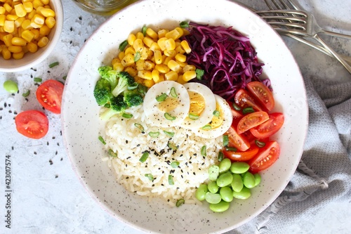 Rice salad with vegetables and sesame on light background. Top view with copy space. Healthy eating.