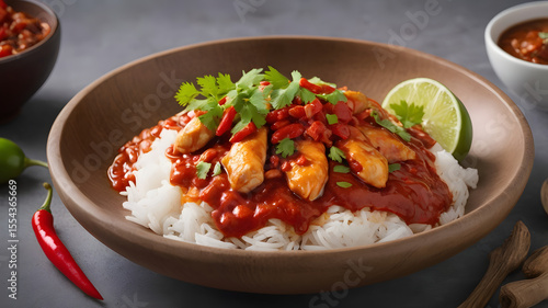 Rice topped with chicken breast chili paste