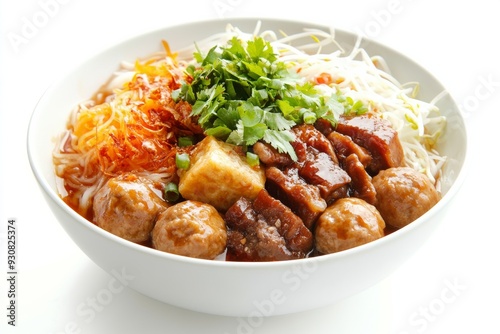 Rice vermicelli noodle and meatball Braised pork and tofu pork in the bowl, isolated on white background