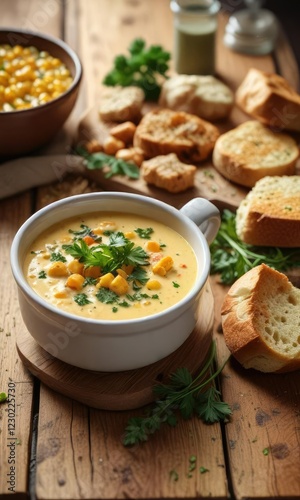 Rich and creamy corn chowder with a sprinkle of chopped parsley and crunchy croutons on a wooden table, creamy, chowder, rich