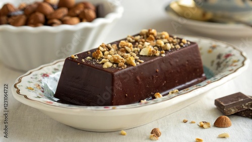 Rich, velvety chocolate fudge with a crunchy nutty topping nestled in a delicate porcelain dish, fudge, rich flavors