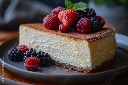 Ricotta Cheesecake: A slice of light and creamy ricotta cheesecake, possibly garnished with fresh berries.