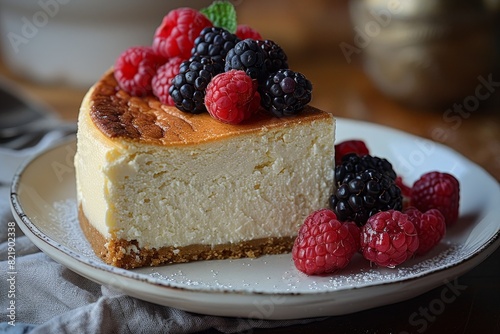 Ricotta Cheesecake: A slice of light and creamy ricotta cheesecake, possibly garnished with fresh berries.