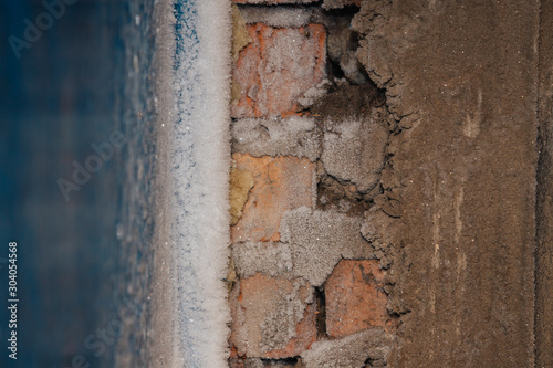 Rime and frost on the wall. Small pieces of ice. Cold in the room.