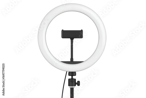 smartphone, mobile phone, illuminated, lighting, photo, video, web log, technology, equipment, studio, setup, modern, communication, online, cyberspace, digital, streaming, broadcast, broadcasting, creativity, innovation, led, circle, round, black, racked, tripod, holder, device, mobile, screen, image, photo, film, motion picture, production, professional, transparent, background, isolated, white