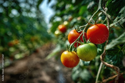 tomatoes, tomatoes, vine, green, red, plant, agriculture, farming, greenhouse, garden, growing, ripening, sunlit, horticulture, cultivation, vegetable, food, produce, organic, healthy, fresh, nature, closeup, detail, vibrant, colours, bright, juicy, summer, harvest, crop, dirtied, leaf, tree branch, stem, background, blurry, sharpened, depth, field, row, plantation, farm