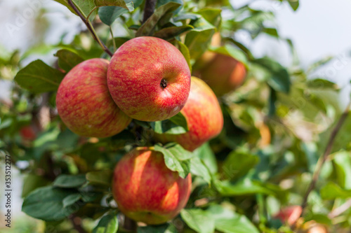 ripe apples honeycrisp on apple tree branch.