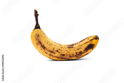 banana, fruit, yellow, brown, peel, ripe, overmature, white background, isolated, closeup, pulp