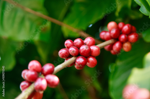 Ripe berries on coffee tree in farm. Food and drink coffee
