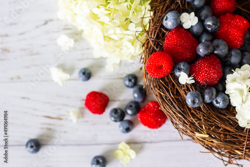 Ripe blueberries and Tibetan raspberries lie in a basket of vines