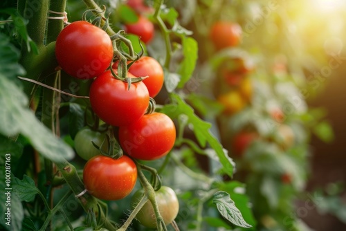 Ripe cherry tomatoes on plants in greenhouse Fresh red tomatoes in organic garden